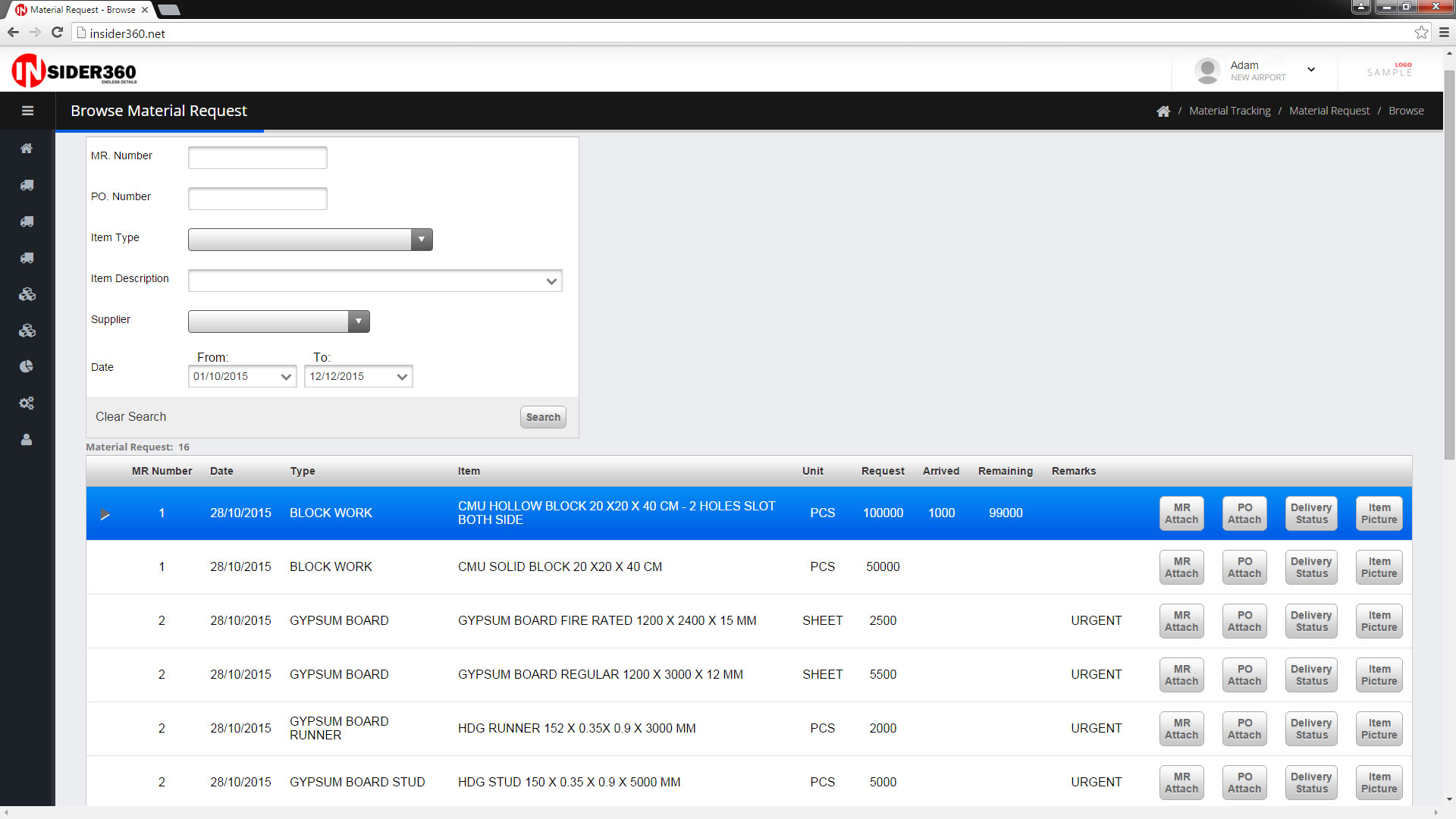 INSIDER360 provides you a full tracking module to all your material documentation, order quantities, ordered by whom, order date, order status and delivery status. The system assists you to follow up your materials flow and traffic through several logical stages and gathering information from all other parties instantly.